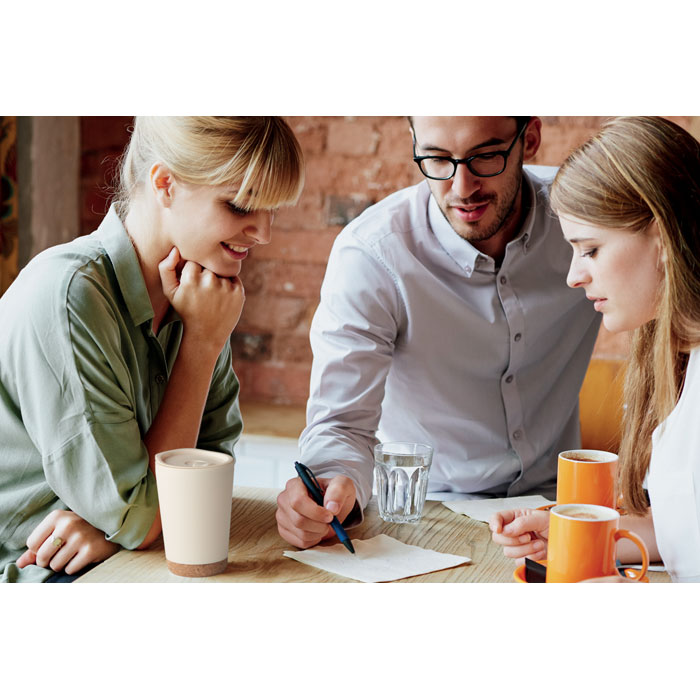 Duplafalú pohár PP-ből, parafa talppal és csúsztatható ivónyílással ellátott, PS-ből és ABS-ből készült fedéllel. Űrtartalom: 300 ml. Ø8X12CM
