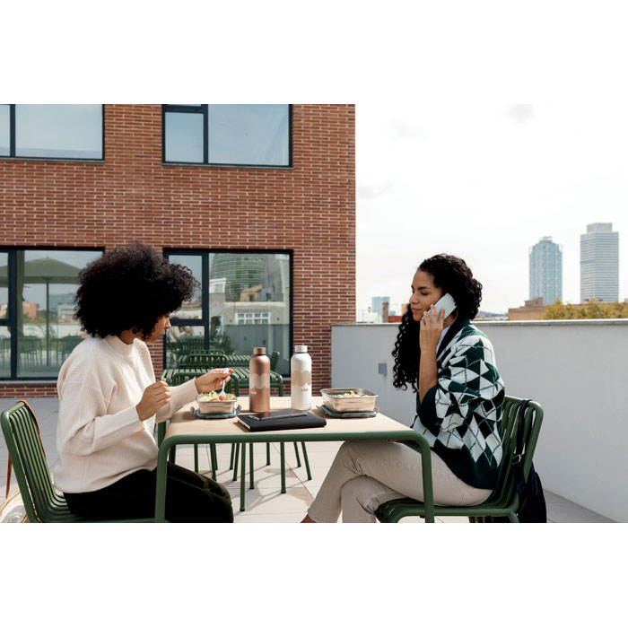 Újrahasznosított, rozsdamentes acél uzsonnásdoboz, PP fedéllel és 4 oldalas kattintós záródással. Űrtartalom: 850 ml. 19X14X6CM