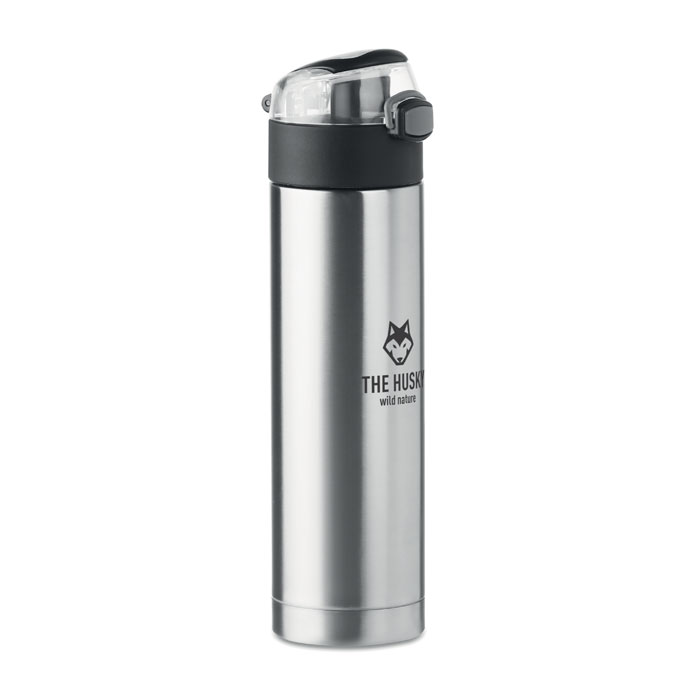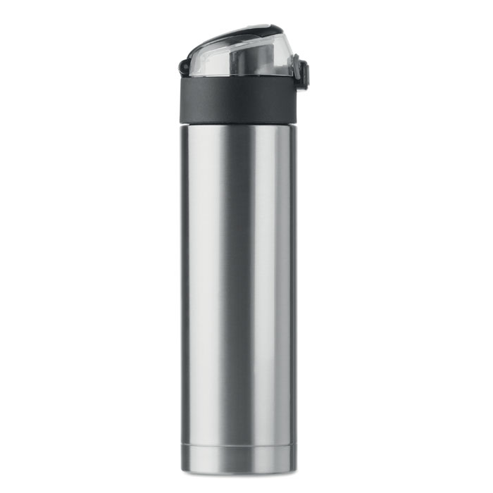 Rozsdamentes acélból készült, duplafalú palack a kupakon biztonsági zárral. Nyomógombbal nyitható. A tetején lévő lehajtható fogantyúval könnyen szállítható. 400 ml űrtartalom. Szivárgásmentes. 6X24.5CM